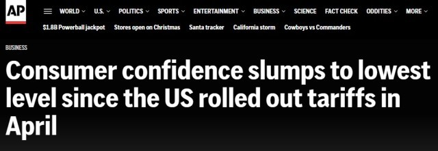 报道称,根据调查给出的书面回复,尽管美国政府一再声称通胀是骗局,但物价上涨和通胀加剧,连同关税问题,仍然是消费者最大的担忧。美国消费者对当前经济状况的评估暴跌9.5点至116.8。
